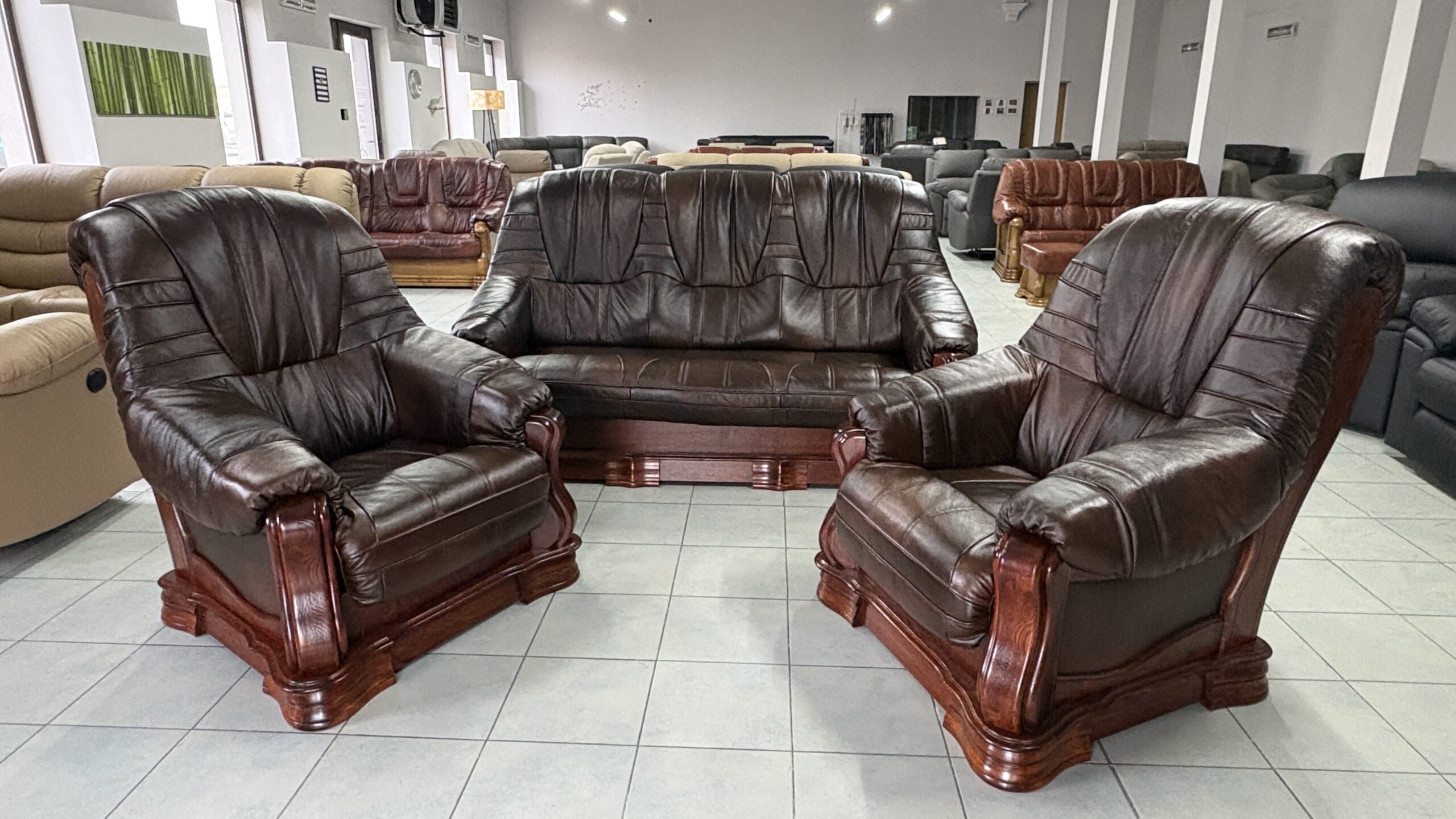 Komplet wypoczynkowy skórzany Oskar modny i nowoczesny zestaw, podkreślający styl i aktualne trendy w meblarstwie. Jeżeli cenicie sobie Państwo uniwersalność i funkcjonalność to nasza propozycja z całą pewnością spełni te oczekiwania.Wysoki komfort użytkowania zawdzięcza zastosowaniu wysokosprężystej pianki poliuretanowej HR T-25.Boki stolarki dębowej skóra + ozdobne cekiny.